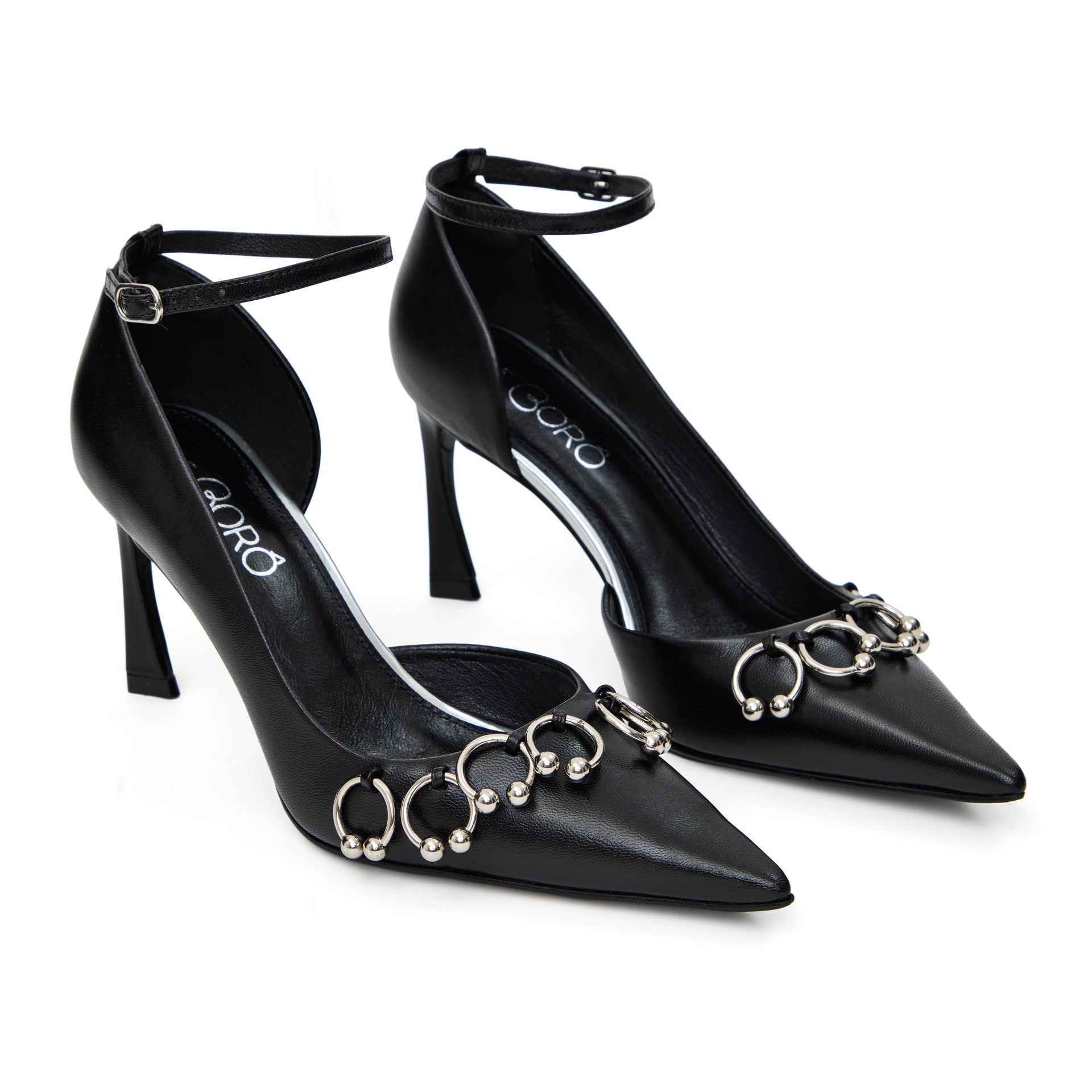 The upper features a deep, flattering cut, adorned with piercing-inspired metal appliqués that bring personality without compromising sophistication. An optional ankle strap allows you to choose between a cleaner silhouette or extra support.