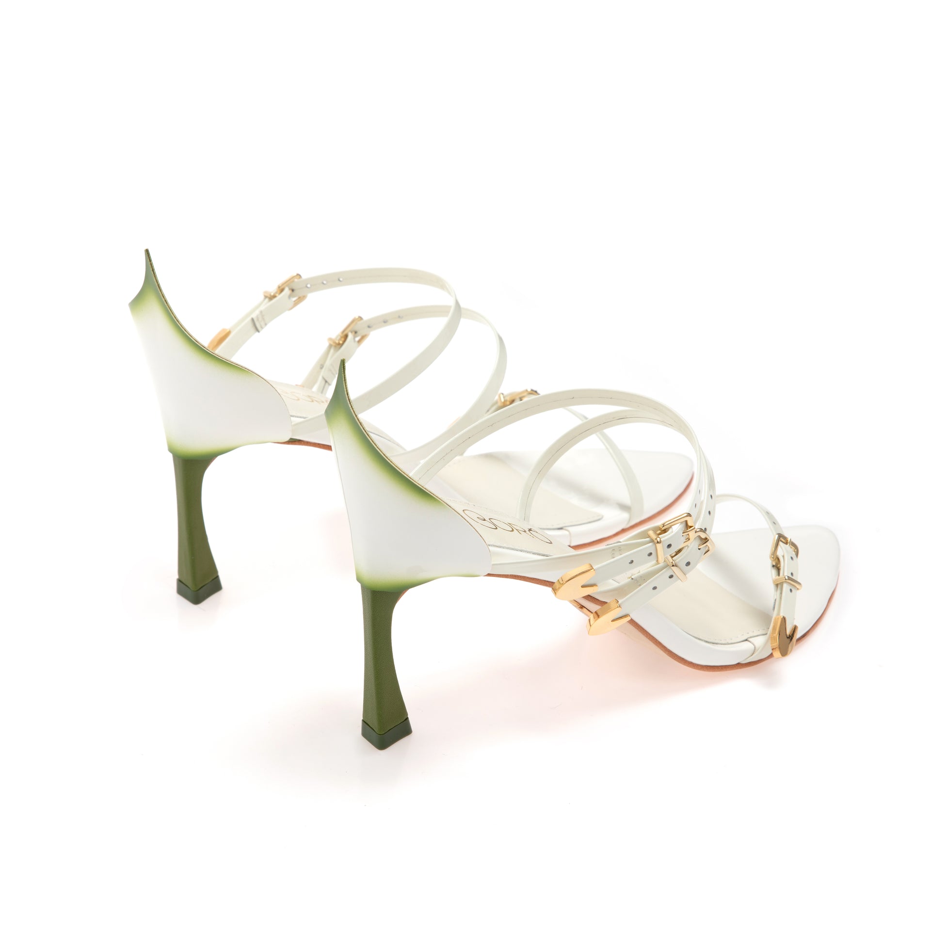 Inspired by the iconic Calla Lily, the Calla Mule is a wearable sculpture — delicate in structure, bold in design. Its hand-painted heel fades from white to green, mimicking the natural beauty of a flower stem, while fine leather straps and golden buckles embrace the foot with elegance and precision.