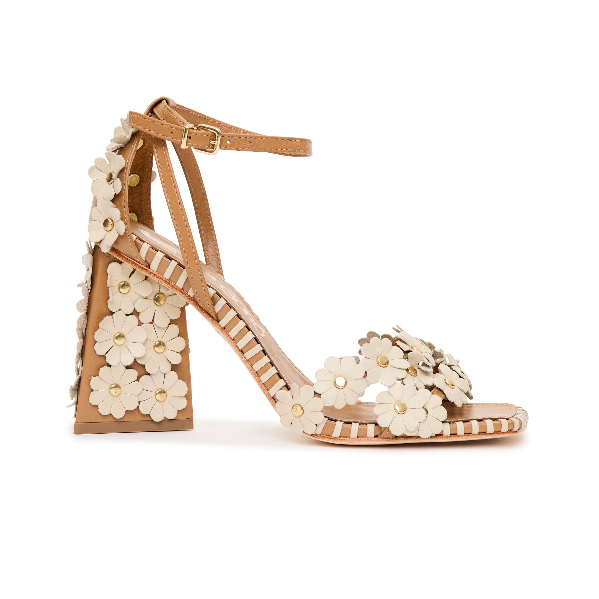 Our best-selling sculptural flower heel, handcrafted with up to 80 leather daisies. Three heel heights. The ultimate perfect fit.